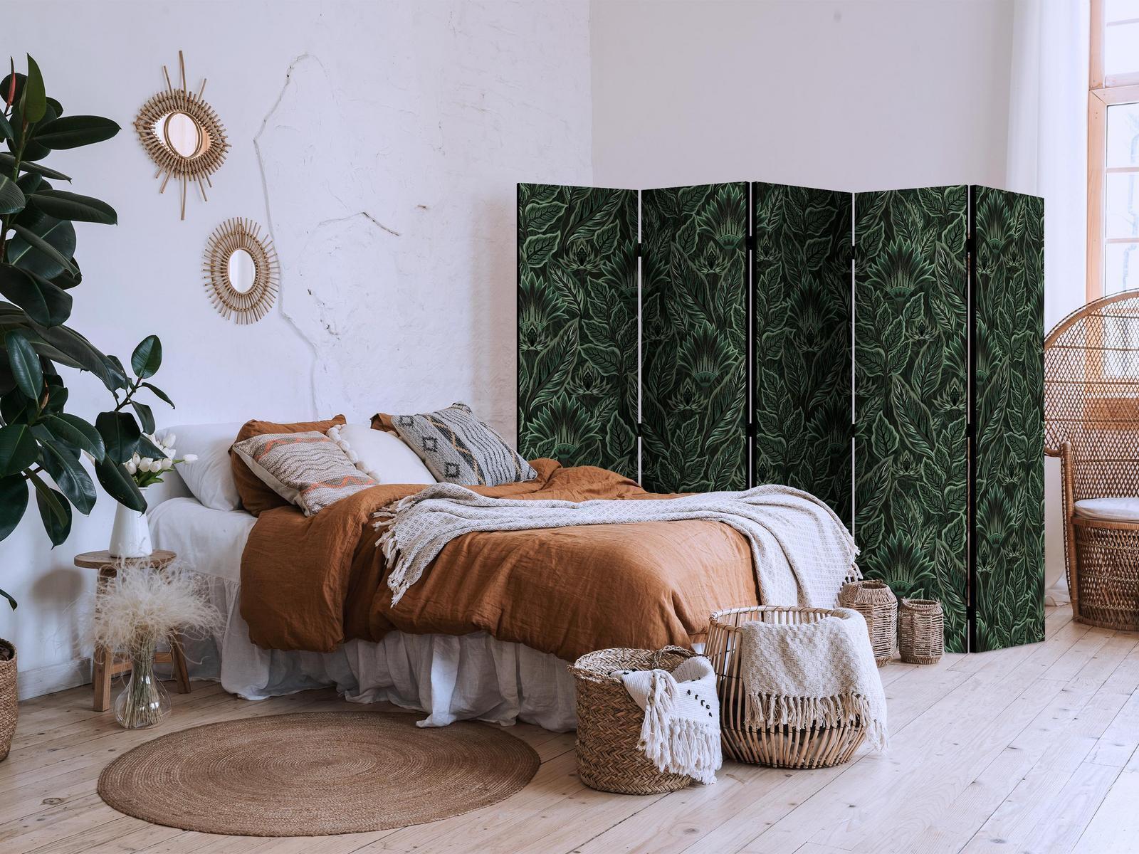 Paravents sind hervorragende Dekorationselemente, die auf vielfältige Weise eingesetzt werden können. Sie verbinden perfekt Funktionalität und originelle Ästhetik. Aus diesem Grund sind sie sehr beliebt. Der Hauptvorteil ist, dass diese Dekoration einen Raum unterteilen kann, ohne dass Renovierungsarbeiten erforderlich sind. Im Folgenden finden Sie die Vorteile dieses Gestaltungselements – lassen Sie sich davon für Ihre Einrichtung inspirieren. Sie können die Paravents aus unserem Sortiment in drei Varianten kaufen, und jede von ihnen erfüllt eine interessante Funktion: Paravent – einseitig bedruckt, Paravent – doppelseitig bedruckt, Akustischer Paravent. Dies ist ein klarer Beweis dafür, dass die Trennwände auch sehr nützlich sind. Viele Menschen verwenden sie zum Beispiel, um einen Raum optisch zu unterteilen oder einen Teil davon zu verbergen. Der Raumtrenner ist auch häufig in Wirtschaftsräumen zu finden, zum Beispiel in einem Friseursalon, einem Boutique oder einer Arztpraxis. Jeder schätzt die Ästhetik und den praktischen Nutzen dieser Dekoration. Mit Raumteiler Paravent "Paravent - Dense Vegetation - Botanical Patterns in Illustrative Style; Green" können Sie Räume in Zonen aufteilen – das Schlafzimmer in Schlaf- und Garderobenbereiche, das Wohnzimmer in Sitz- und Essbereiche. Gestalten Sie Ihre Home-Office-Ecke und grenzen Sie den Bürobereich im Wohnzimmer mit einem stilvollen Raumteiler ab. Wie Sie es verwenden, hängt von Ihrer Phantasie, Ihren Bedürfnissen und Vorlieben ab.