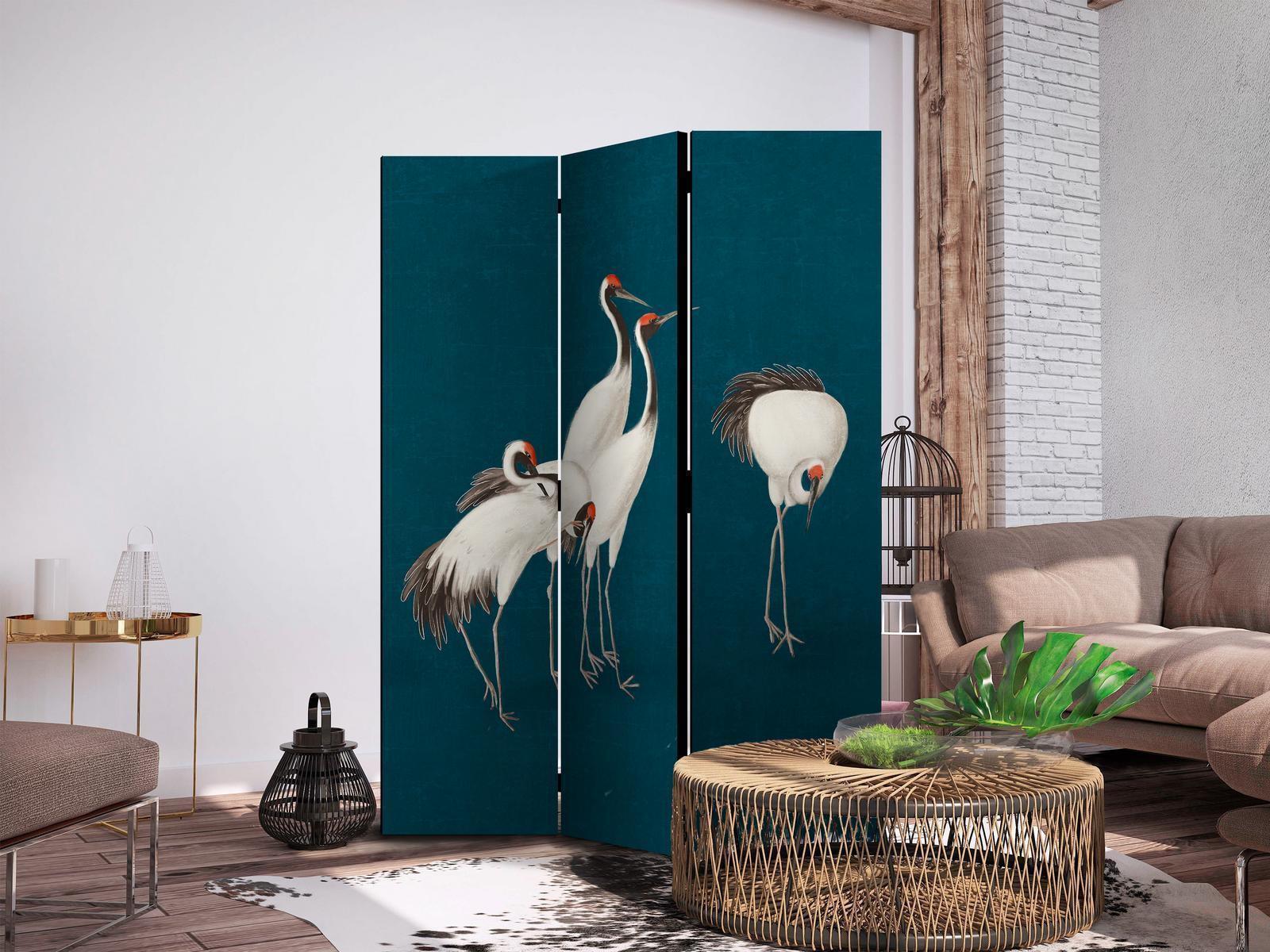 Paravents sind hervorragende Dekorationselemente, die auf vielfältige Weise eingesetzt werden können. Sie verbinden perfekt Funktionalität und originelle Ästhetik. Aus diesem Grund sind sie sehr beliebt. Der Hauptvorteil ist, dass diese Dekoration einen Raum unterteilen kann, ohne dass Renovierungsarbeiten erforderlich sind. Im Folgenden finden Sie die Vorteile dieses Gestaltungselements – lassen Sie sich davon für Ihre Einrichtung inspirieren. Sie können die Paravents aus unserem Sortiment in drei Varianten kaufen, und jede von ihnen erfüllt eine interessante Funktion: Paravent – einseitig bedruckt, Paravent – doppelseitig bedruckt, Akustischer Paravent. Dies ist ein klarer Beweis dafür, dass die Trennwände auch sehr nützlich sind. Viele Menschen verwenden sie zum Beispiel, um einen Raum optisch zu unterteilen oder einen Teil davon zu verbergen. Der Raumtrenner ist auch häufig in Wirtschaftsräumen zu finden, zum Beispiel in einem Friseursalon, einem Boutique oder einer Arztpraxis. Jeder schätzt die Ästhetik und den praktischen Nutzen dieser Dekoration. Mit Raumteiler Paravent "Paravent - Evening by the pond - a group of cranes drawn with dry pastels on a dark turquoise background" können Sie Räume in Zonen aufteilen – das Schlafzimmer in Schlaf- und Garderobenbereiche, das Wohnzimmer in Sitz- und Essbereiche. Gestalten Sie Ihre Home-Office-Ecke und grenzen Sie den Bürobereich im Wohnzimmer mit einem stilvollen Raumteiler ab. Wie Sie es verwenden, hängt von Ihrer Phantasie, Ihren Bedürfnissen und Vorlieben ab.