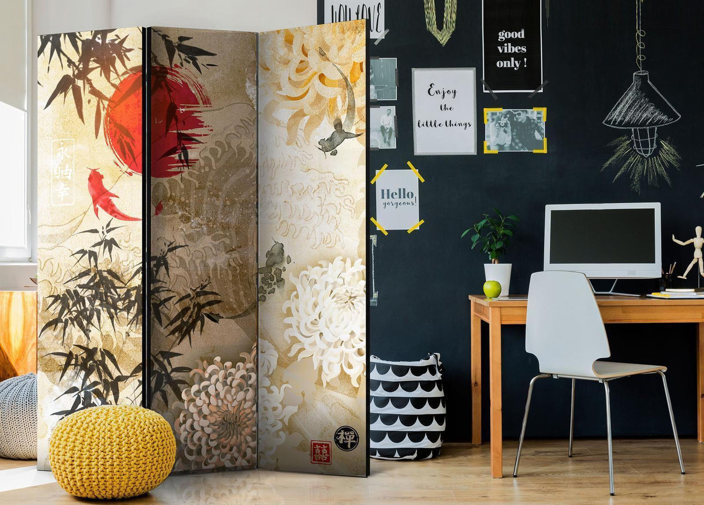 Paravents sind hervorragende Dekorationselemente, die auf vielfältige Weise eingesetzt werden können. Sie verbinden perfekt Funktionalität und originelle Ästhetik. Aus diesem Grund sind sie sehr beliebt. Der Hauptvorteil ist, dass diese Dekoration einen Raum unterteilen kann, ohne dass Renovierungsarbeiten erforderlich sind. Im Folgenden finden Sie die Vorteile dieses Gestaltungselements – lassen Sie sich davon für Ihre Einrichtung inspirieren. Sie können die Paravents aus unserem Sortiment in drei Varianten kaufen, und jede von ihnen erfüllt eine interessante Funktion: Paravent – einseitig bedruckt, Paravent – doppelseitig bedruckt, Akustischer Paravent. Dies ist ein klarer Beweis dafür, dass die Trennwände auch sehr nützlich sind. Viele Menschen verwenden sie zum Beispiel, um einen Raum optisch zu unterteilen oder einen Teil davon zu verbergen. Der Raumtrenner ist auch häufig in Wirtschaftsräumen zu finden, zum Beispiel in einem Friseursalon, einem Boutique oder einer Arztpraxis. Jeder schätzt die Ästhetik und den praktischen Nutzen dieser Dekoration. Mit Raumteiler Paravent "Paravent - Fish Dance" können Sie Räume in Zonen aufteilen – das Schlafzimmer in Schlaf- und Garderobenbereiche, das Wohnzimmer in Sitz- und Essbereiche. Gestalten Sie Ihre Home-Office-Ecke und grenzen Sie den Bürobereich im Wohnzimmer mit einem stilvollen Raumteiler ab. Wie Sie es verwenden, hängt von Ihrer Phantasie, Ihren Bedürfnissen und Vorlieben ab.