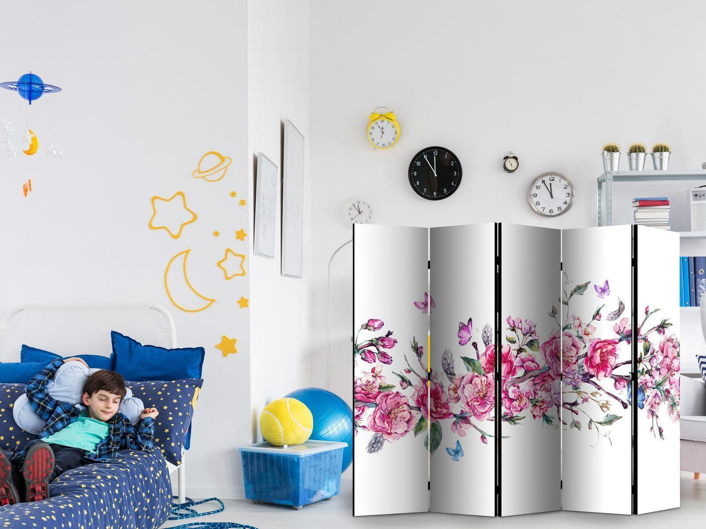 Die spanische Wand kann sowohl im Wohnzimmer, Schlafzimmer, Kinderzimmer, Badezimmer als auch in der Küche aufgestellt werden. Viele Büro-, Restaurant- und Clubbesitzer entscheiden sich häufig für diese dekorative Lösung in ihren Räumlichkeiten. Die spanische Wand "Paravent - Flowers and Butterflies II" ist aus geruchsneutralen Materialien hergestellt, die sicher sind und daher keine Allergien auslösen. Es ist eine vielseitige Dekorationsmöglichkeit, die viele Vorteile hat. Der Hauptvorteil ist, dass diese Dekoration leicht zu bewegen ist, so dass sie schnell und einfach neu positioniert werden kann. Wichtig ist, dass die inneren Trennwände einen UV-Schutz haben, so dass die Farben auch im Laufe der Jahre intensiv bleiben. Der Raumteiler hat Designs, die die Einrichtung jedes Raumes ergänzen können.Details zur Produktsicherheit