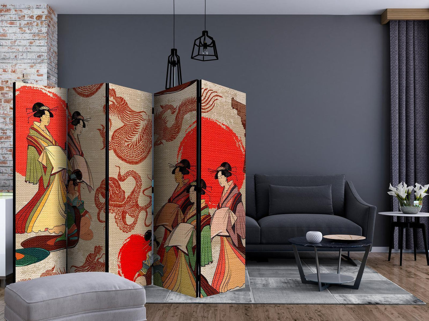Paravents sind hervorragende Dekorationselemente, die auf vielfältige Weise eingesetzt werden können. Sie verbinden perfekt Funktionalität und originelle Ästhetik. Aus diesem Grund sind sie sehr beliebt. Der Hauptvorteil ist, dass diese Dekoration einen Raum unterteilen kann, ohne dass Renovierungsarbeiten erforderlich sind. Im Folgenden finden Sie die Vorteile dieses Gestaltungselements – lassen Sie sich davon für Ihre Einrichtung inspirieren. Sie können die Paravents aus unserem Sortiment in drei Varianten kaufen, und jede von ihnen erfüllt eine interessante Funktion: Paravent – einseitig bedruckt, Paravent – doppelseitig bedruckt, Akustischer Paravent. Dies ist ein klarer Beweis dafür, dass die Trennwände auch sehr nützlich sind. Viele Menschen verwenden sie zum Beispiel, um einen Raum optisch zu unterteilen oder einen Teil davon zu verbergen. Der Raumtrenner ist auch häufig in Wirtschaftsräumen zu finden, zum Beispiel in einem Friseursalon, einem Boutique oder einer Arztpraxis. Jeder schätzt die Ästhetik und den praktischen Nutzen dieser Dekoration. Mit Raumteiler Paravent "Paravent - Geishas II" können Sie Räume in Zonen aufteilen – das Schlafzimmer in Schlaf- und Garderobenbereiche, das Wohnzimmer in Sitz- und Essbereiche. Gestalten Sie Ihre Home-Office-Ecke und grenzen Sie den Bürobereich im Wohnzimmer mit einem stilvollen Raumteiler ab. Wie Sie es verwenden, hängt von Ihrer Phantasie, Ihren Bedürfnissen und Vorlieben ab.
