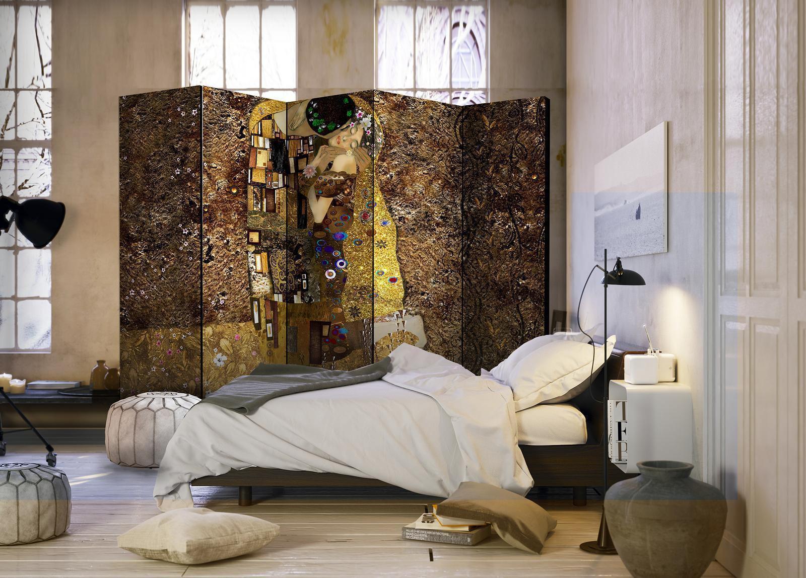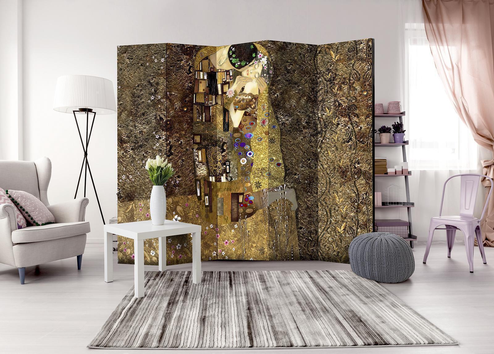 Die spanische Wand kann sowohl im Wohnzimmer, Schlafzimmer, Kinderzimmer, Badezimmer als auch in der Küche aufgestellt werden. Viele Büro-, Restaurant- und Clubbesitzer entscheiden sich häufig für diese dekorative Lösung in ihren Räumlichkeiten. Die spanische Wand "Paravent - Golden Kiss II" ist aus geruchsneutralen Materialien hergestellt, die sicher sind und daher keine Allergien auslösen. Es ist eine vielseitige Dekorationsmöglichkeit, die viele Vorteile hat. Der Hauptvorteil ist, dass diese Dekoration leicht zu bewegen ist, so dass sie schnell und einfach neu positioniert werden kann. Wichtig ist, dass die inneren Trennwände einen UV-Schutz haben, so dass die Farben auch im Laufe der Jahre intensiv bleiben. Der Raumteiler hat Designs, die die Einrichtung jedes Raumes ergänzen können.Details zur Produktsicherheit