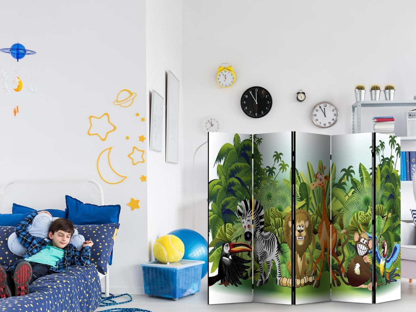 Die spanische Wand kann sowohl im Wohnzimmer, Schlafzimmer, Kinderzimmer, Badezimmer als auch in der Küche aufgestellt werden. Viele Büro-, Restaurant- und Clubbesitzer entscheiden sich häufig für diese dekorative Lösung in ihren Räumlichkeiten. Die spanische Wand "Paravent - Jungle Animals II" ist aus geruchsneutralen Materialien hergestellt, die sicher sind und daher keine Allergien auslösen. Es ist eine vielseitige Dekorationsmöglichkeit, die viele Vorteile hat. Der Hauptvorteil ist, dass diese Dekoration leicht zu bewegen ist, so dass sie schnell und einfach neu positioniert werden kann. Wichtig ist, dass die inneren Trennwände einen UV-Schutz haben, so dass die Farben auch im Laufe der Jahre intensiv bleiben. Der Raumteiler hat Designs, die die Einrichtung jedes Raumes ergänzen können.Details zur Produktsicherheit