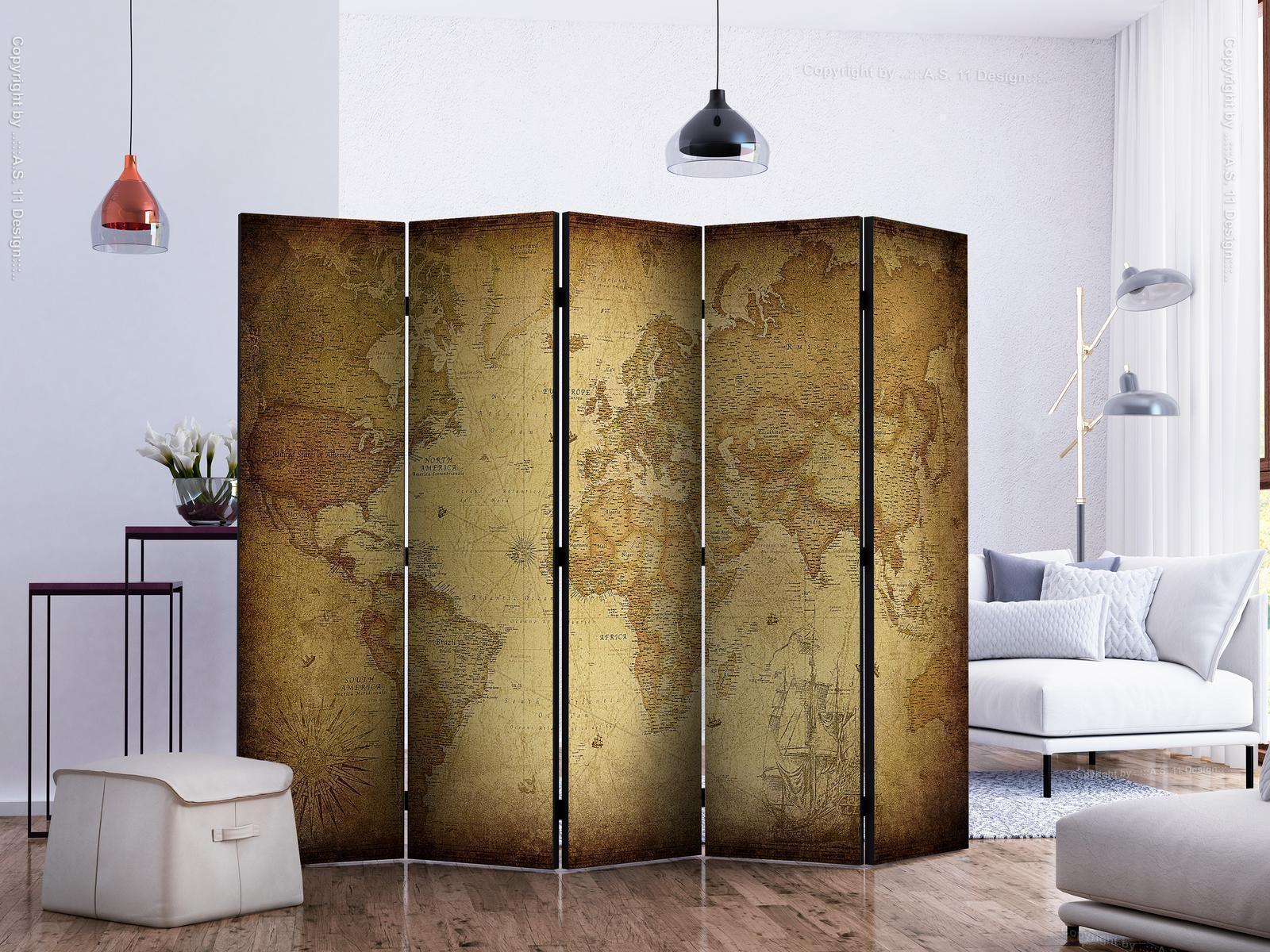 Die spanische Wand kann sowohl im Wohnzimmer, Schlafzimmer, Kinderzimmer, Badezimmer als auch in der Küche aufgestellt werden. Viele Büro-, Restaurant- und Clubbesitzer entscheiden sich häufig für diese dekorative Lösung in ihren Räumlichkeiten. Die spanische Wand "Paravent - Old map II" ist aus geruchsneutralen Materialien hergestellt, die sicher sind und daher keine Allergien auslösen. Es ist eine vielseitige Dekorationsmöglichkeit, die viele Vorteile hat. Der Hauptvorteil ist, dass diese Dekoration leicht zu bewegen ist, so dass sie schnell und einfach neu positioniert werden kann. Wichtig ist, dass die inneren Trennwände einen UV-Schutz haben, so dass die Farben auch im Laufe der Jahre intensiv bleiben. Der Raumteiler hat Designs, die die Einrichtung jedes Raumes ergänzen können.Details zur Produktsicherheit