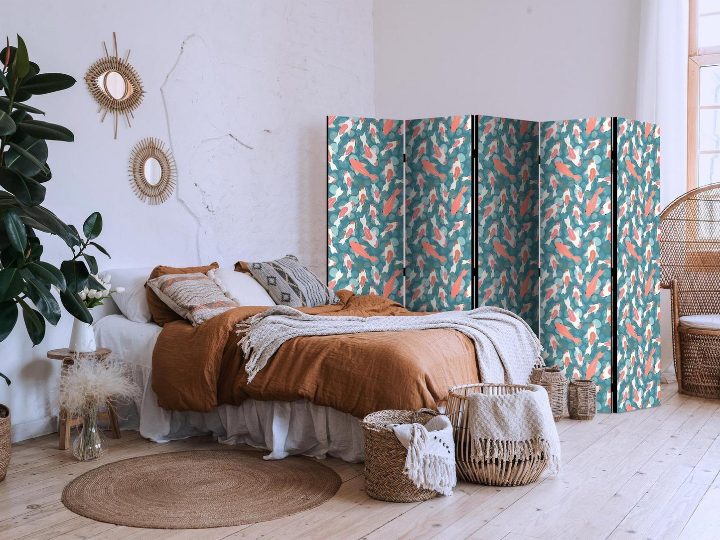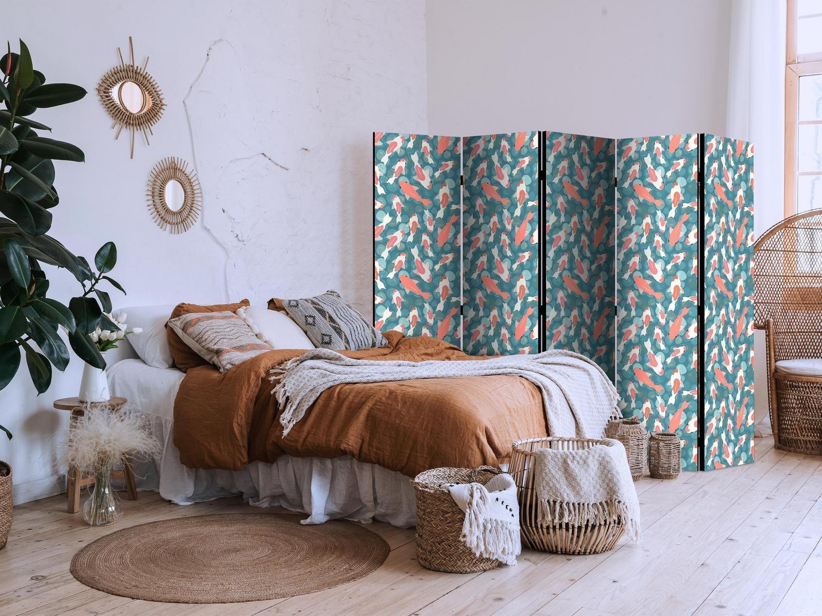 Paravents sind hervorragende Dekorationselemente, die auf vielfältige Weise eingesetzt werden können. Sie verbinden perfekt Funktionalität und originelle Ästhetik. Aus diesem Grund sind sie sehr beliebt. Der Hauptvorteil ist, dass diese Dekoration einen Raum unterteilen kann, ohne dass Renovierungsarbeiten erforderlich sind. Im Folgenden finden Sie die Vorteile dieses Gestaltungselements – lassen Sie sich davon für Ihre Einrichtung inspirieren. Sie können die Paravents aus unserem Sortiment in drei Varianten kaufen, und jede von ihnen erfüllt eine interessante Funktion: Paravent – einseitig bedruckt, Paravent – doppelseitig bedruckt, Akustischer Paravent. Dies ist ein klarer Beweis dafür, dass die Trennwände auch sehr nützlich sind. Viele Menschen verwenden sie zum Beispiel, um einen Raum optisch zu unterteilen oder einen Teil davon zu verbergen. Der Raumtrenner ist auch häufig in Wirtschaftsräumen zu finden, zum Beispiel in einem Friseursalon, einem Boutique oder einer Arztpraxis. Jeder schätzt die Ästhetik und den praktischen Nutzen dieser Dekoration. Mit Raumteiler Paravent "Paravent - Oriental Pond - A Cluster of Japanese Fish Swimming in Crystal Clear Water with Glimmers of Light" können Sie Räume in Zonen aufteilen – das Schlafzimmer in Schlaf- und Garderobenbereiche, das Wohnzimmer in Sitz- und Essbereiche. Gestalten Sie Ihre Home-Office-Ecke und grenzen Sie den Bürobereich im Wohnzimmer mit einem stilvollen Raumteiler ab. Wie Sie es verwenden, hängt von Ihrer Phantasie, Ihren Bedürfnissen und Vorlieben ab.