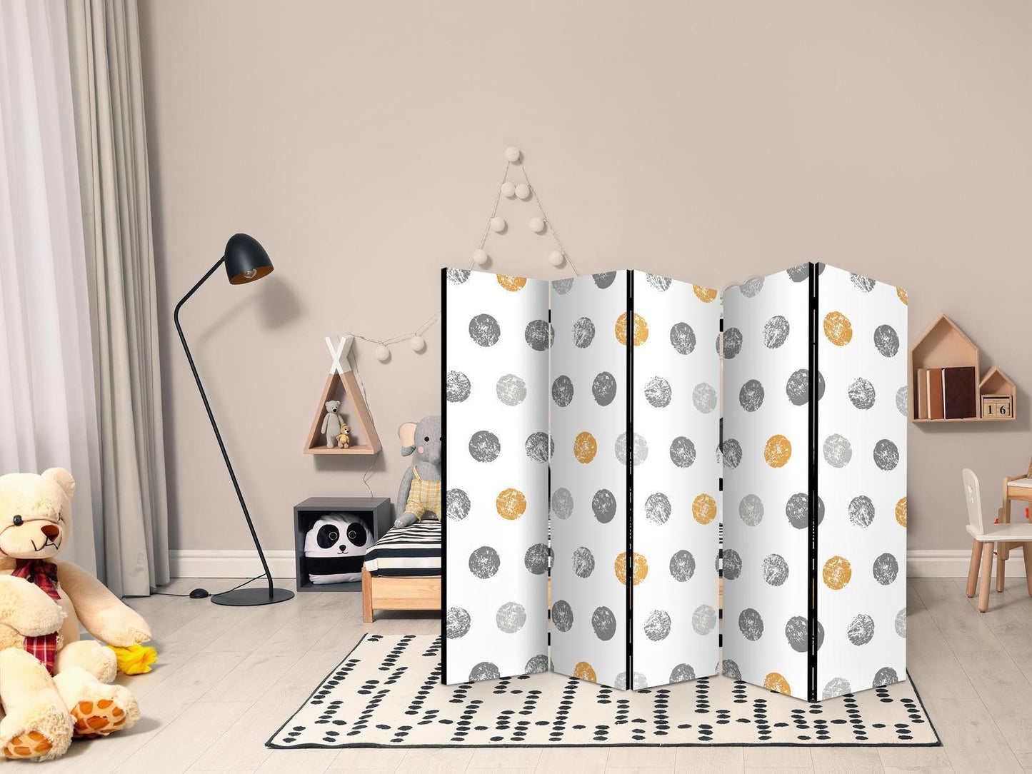 Die spanische Wand kann sowohl im Wohnzimmer, Schlafzimmer, Kinderzimmer, Badezimmer als auch in der Küche aufgestellt werden. Viele Büro-, Restaurant- und Clubbesitzer entscheiden sich häufig für diese dekorative Lösung in ihren Räumlichkeiten. Die spanische Wand "Paravent - Round Stamps II" ist aus geruchsneutralen Materialien hergestellt, die sicher sind und daher keine Allergien auslösen. Es ist eine vielseitige Dekorationsmöglichkeit, die viele Vorteile hat. Der Hauptvorteil ist, dass diese Dekoration leicht zu bewegen ist, so dass sie schnell und einfach neu positioniert werden kann. Wichtig ist, dass die inneren Trennwände einen UV-Schutz haben, so dass die Farben auch im Laufe der Jahre intensiv bleiben. Der Raumteiler hat Designs, die die Einrichtung jedes Raumes ergänzen können.Details zur Produktsicherheit