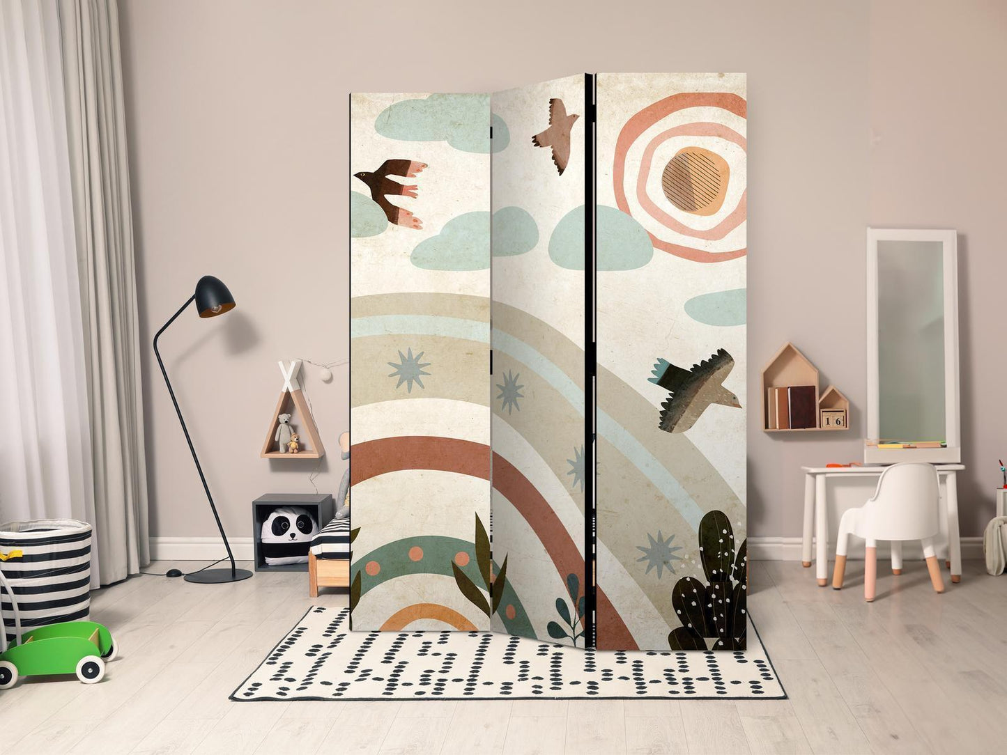 Paravent - Sun Above the Rainbow - Birds in Subdued Colors Flying Among Clouds Above a Rainbow and Vegetation on a Light Beige Background