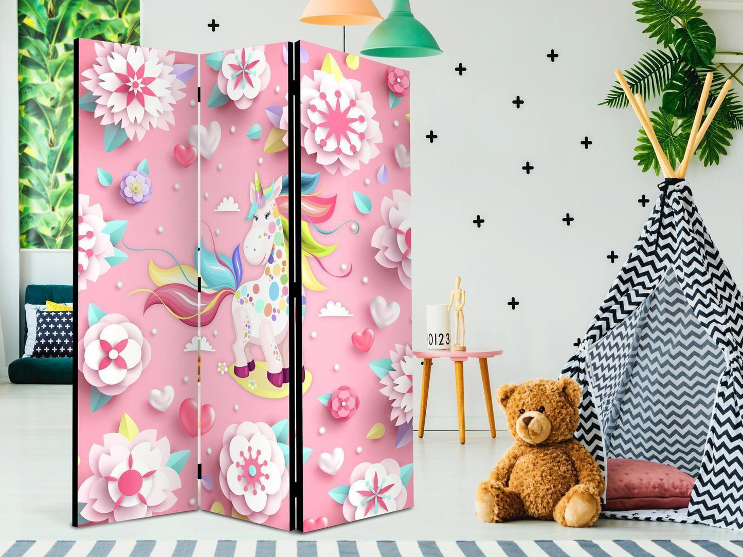 Die spanische Wand kann sowohl im Wohnzimmer, Schlafzimmer, Kinderzimmer, Badezimmer als auch in der Küche aufgestellt werden. Viele Büro-, Restaurant- und Clubbesitzer entscheiden sich häufig für diese dekorative Lösung in ihren Räumlichkeiten. Die spanische Wand "Paravent - Unicorn on Flowerbed" ist aus geruchsneutralen Materialien hergestellt, die sicher sind und daher keine Allergien auslösen. Es ist eine vielseitige Dekorationsmöglichkeit, die viele Vorteile hat. Der Hauptvorteil ist, dass diese Dekoration leicht zu bewegen ist, so dass sie schnell und einfach neu positioniert werden kann. Wichtig ist, dass die inneren Trennwände einen UV-Schutz haben, so dass die Farben auch im Laufe der Jahre intensiv bleiben. Der Raumteiler hat Designs, die die Einrichtung jedes Raumes ergänzen können.Details zur Produktsicherheit