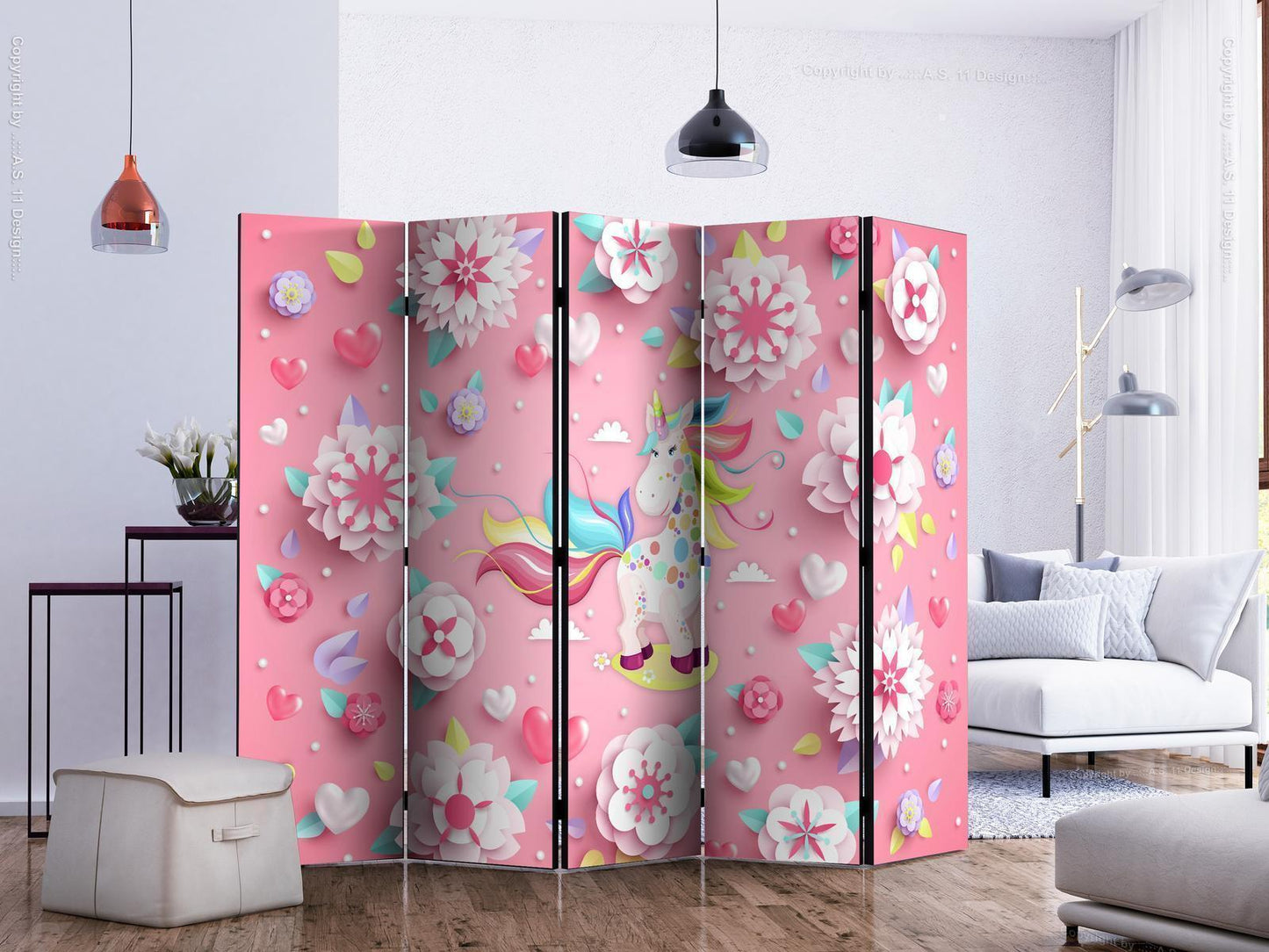 Paravents sind hervorragende Dekorationselemente, die auf vielfältige Weise eingesetzt werden können. Sie verbinden perfekt Funktionalität und originelle Ästhetik. Aus diesem Grund sind sie sehr beliebt. Der Hauptvorteil ist, dass diese Dekoration einen Raum unterteilen kann, ohne dass Renovierungsarbeiten erforderlich sind. Im Folgenden finden Sie die Vorteile dieses Gestaltungselements – lassen Sie sich davon für Ihre Einrichtung inspirieren. Sie können die Paravents aus unserem Sortiment in drei Varianten kaufen, und jede von ihnen erfüllt eine interessante Funktion: Paravent – einseitig bedruckt, Paravent – doppelseitig bedruckt, Akustischer Paravent. Dies ist ein klarer Beweis dafür, dass die Trennwände auch sehr nützlich sind. Viele Menschen verwenden sie zum Beispiel, um einen Raum optisch zu unterteilen oder einen Teil davon zu verbergen. Der Raumtrenner ist auch häufig in Wirtschaftsräumen zu finden, zum Beispiel in einem Friseursalon, einem Boutique oder einer Arztpraxis. Jeder schätzt die Ästhetik und den praktischen Nutzen dieser Dekoration. Mit Raumteiler Paravent "Paravent - Unicorn on Flowerbed II" können Sie Räume in Zonen aufteilen – das Schlafzimmer in Schlaf- und Garderobenbereiche, das Wohnzimmer in Sitz- und Essbereiche. Gestalten Sie Ihre Home-Office-Ecke und grenzen Sie den Bürobereich im Wohnzimmer mit einem stilvollen Raumteiler ab. Wie Sie es verwenden, hängt von Ihrer Phantasie, Ihren Bedürfnissen und Vorlieben ab.