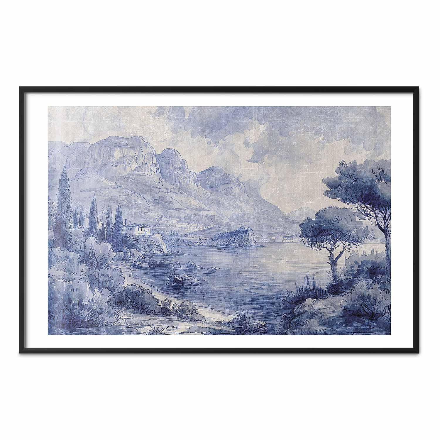 Poster - Blue Bay - Italian Landscape of Lake Como Painted in Blue Ink