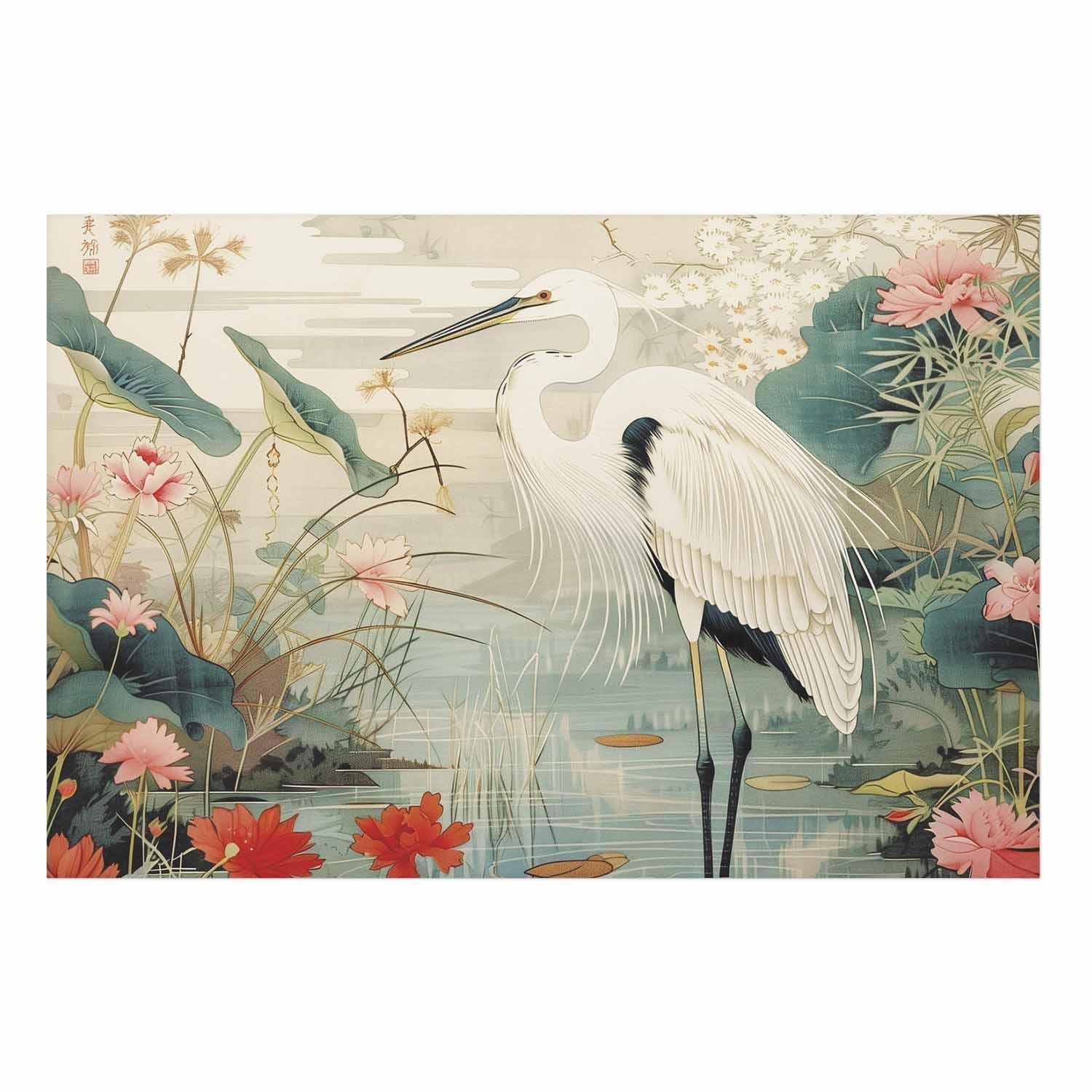 Poster - Over the Asian Pond - illustration in the Japanese print style featuring a heron