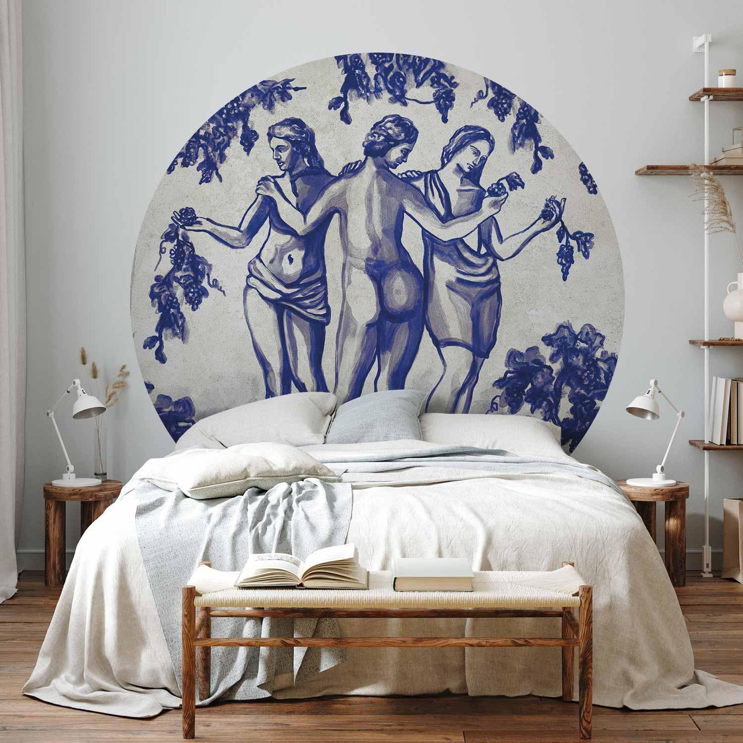 Unsere runden Fototapeten sind selbstklebend, wodurch sie als Wandtattoo oder auf jeder glatten Oberfläche (z. B. Möbel, Nischen, Decke) verwendet werden können. Klebstofffreie Montage erfordert keine Spezialwerkzeuge, die Installation ist schnell und einfach. Schneiden Sie die Tapete einfach mit dem beiliegenden Messer gemäß der mitgelieferten Schablone zu. Dank fortschrittlicher Drucktechnologie bleiben Farben lebendig und Details scharf – über viele Jahre, selbst in sonnendurchfluteten Räumen. Eine breite Auswahl an Mustern und Motiven – von subtilem Minimalismus bis zu farbenreichen Kompositionen – stellt sicher, dass jeder etwas Passendes findet. „Runde Fototapete - Ancient vineyard - three women in a portal painted with blue ink” lässt Ihr Interieur im Handumdrehen frischer wirken und verleiht ihm eine neue Dimension. Die runde Fototapete ist eine hervorragende Alternative zu traditionellen Tapeten und ermöglicht kontinuierliches Experimentieren mit der Gestaltung.