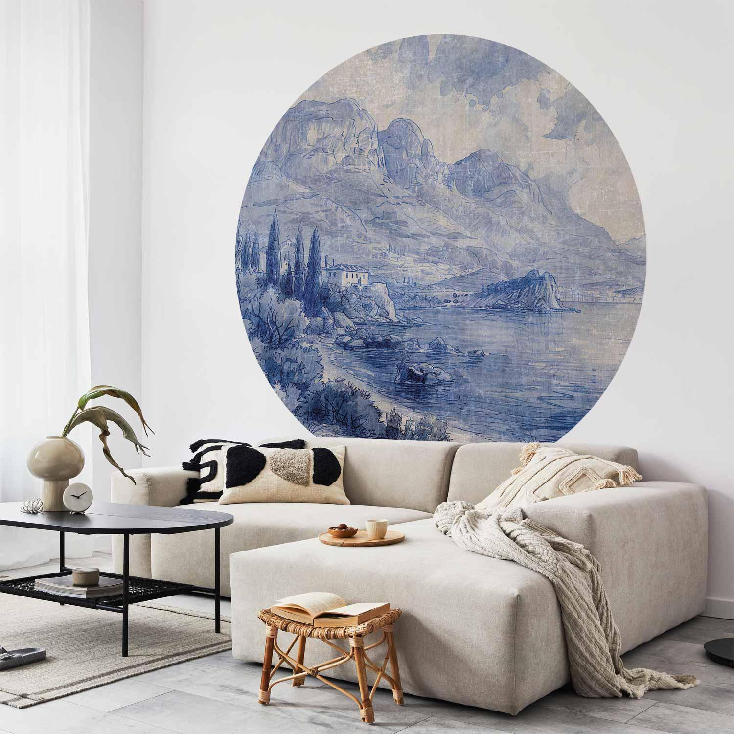 Runde Fototapete - Blue bay - Italian landscape of Lake Como painted with blue ink