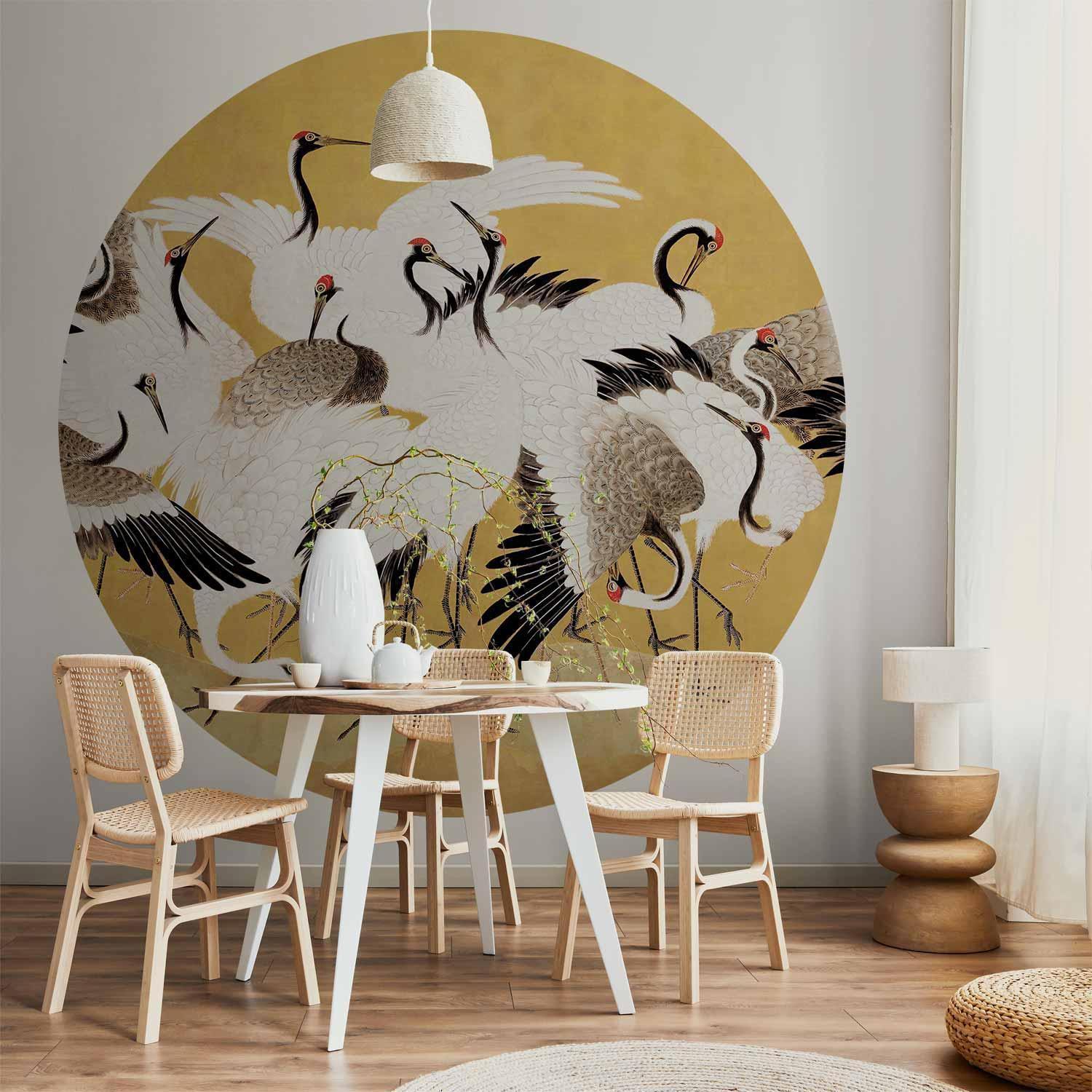 Runde Fototapete - Japanese cranes - a flock of birds against a golden background based on a painting by Ishida Yūtei