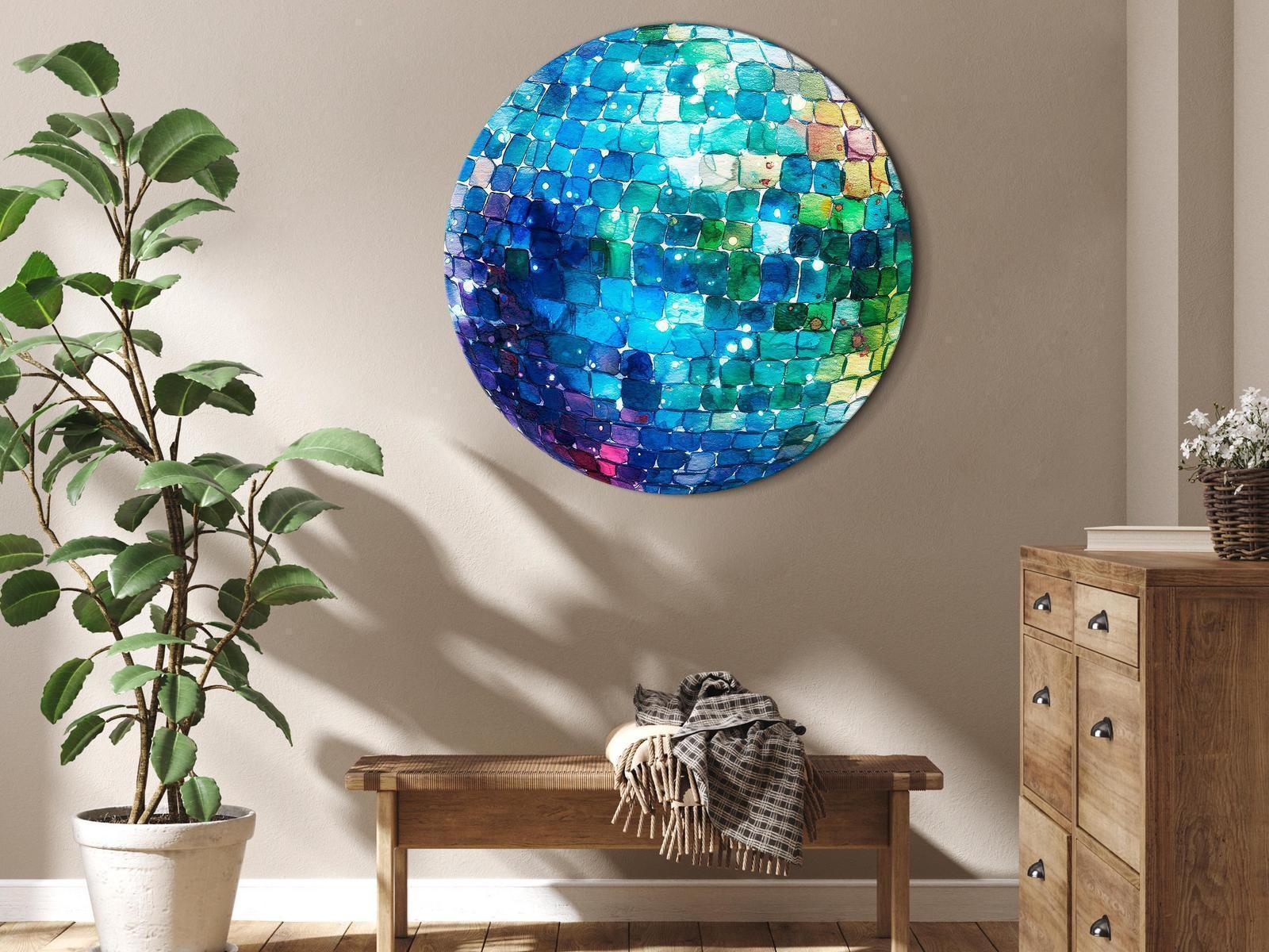 Runde Wandbilder? Warum nicht! Das runde Gemälde, das sich von anderen Produkten auf dem Markt unterscheidet, ist ein idealer Vorschlag für Fans der neuesten Trends. Sanfte, runde Formen tauchen in unseren Innenräumen immer häufiger auf, sei es in Möbellinien, architektonischen Details oder Dekoration. Runde Bilder verkörpern diesen Trend. Sind Sie auf der Suche nach einer originellen Dekoration, deren ungewöhnliche, runde Kreisform die Blicke der Hausbewohner und Gäste auf sich ziehen wird? Das runde Wandbild "Rundes Bild - Turquoise disco ball" ist die perfekte Wahl! Bei der Entwicklung dieses Produkts haben wir das Beste aus unserem Angebot, nämlich einzigartiges Design, sorgfältige Verarbeitung und Innovation in Form eines von unseren Designern entworfenen runden Rahmens, kombiniert. Dadurch erhalten unsere beliebten und trendigen Designs eine neue Form und können ein noch breiteres Publikum erreichen.Wandbilder rund auf italienischer Leinwand gedruckt