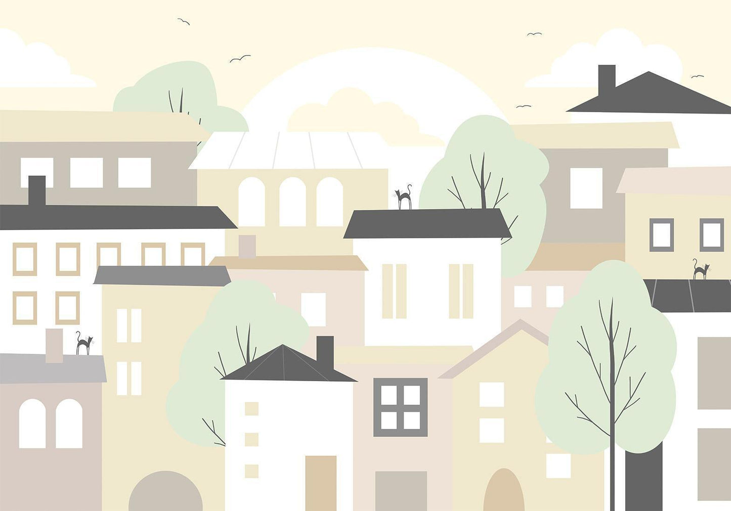 Die sonnige, helle Gestaltung dieser Fototapete schafft eine warme und einladende Atmosphäre im Kinderzimmer. Die verschiedenen Häuser regen die Fantasie an und laden zu imaginären Abenteuern ein, während die natürlichen Elemente wie Bäume und die drei Katzen auf den Dächern eine beruhigende Wirkung haben. Jedes Detail wurde sorgfältig durchdacht, um eine Umgebung zu schaffen, in der sich Kinder wohlfühlen und ihre Kreativität entfalten können.