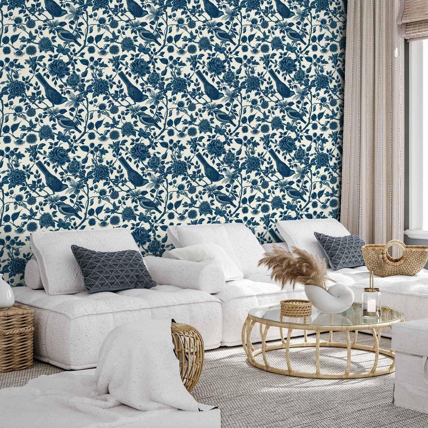 Tapete - Birds and roses - monochrome blue pattern with botanical motif