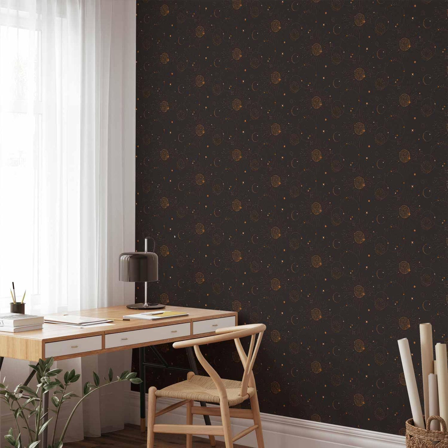 Diese außergewöhnliche Wandtapete zeigt eine künstlerische Komposition von Planeten, Sonnen und Himmelskörpern auf einem dunklen, geheimnisvollen Hintergrund. Die bewusst undefinierbare Farbtiefe zwischen Schwarz und Braun verleiht dem Design einen mystischen Charakter, der moderne Wohnräume besonders edel wirken lässt.