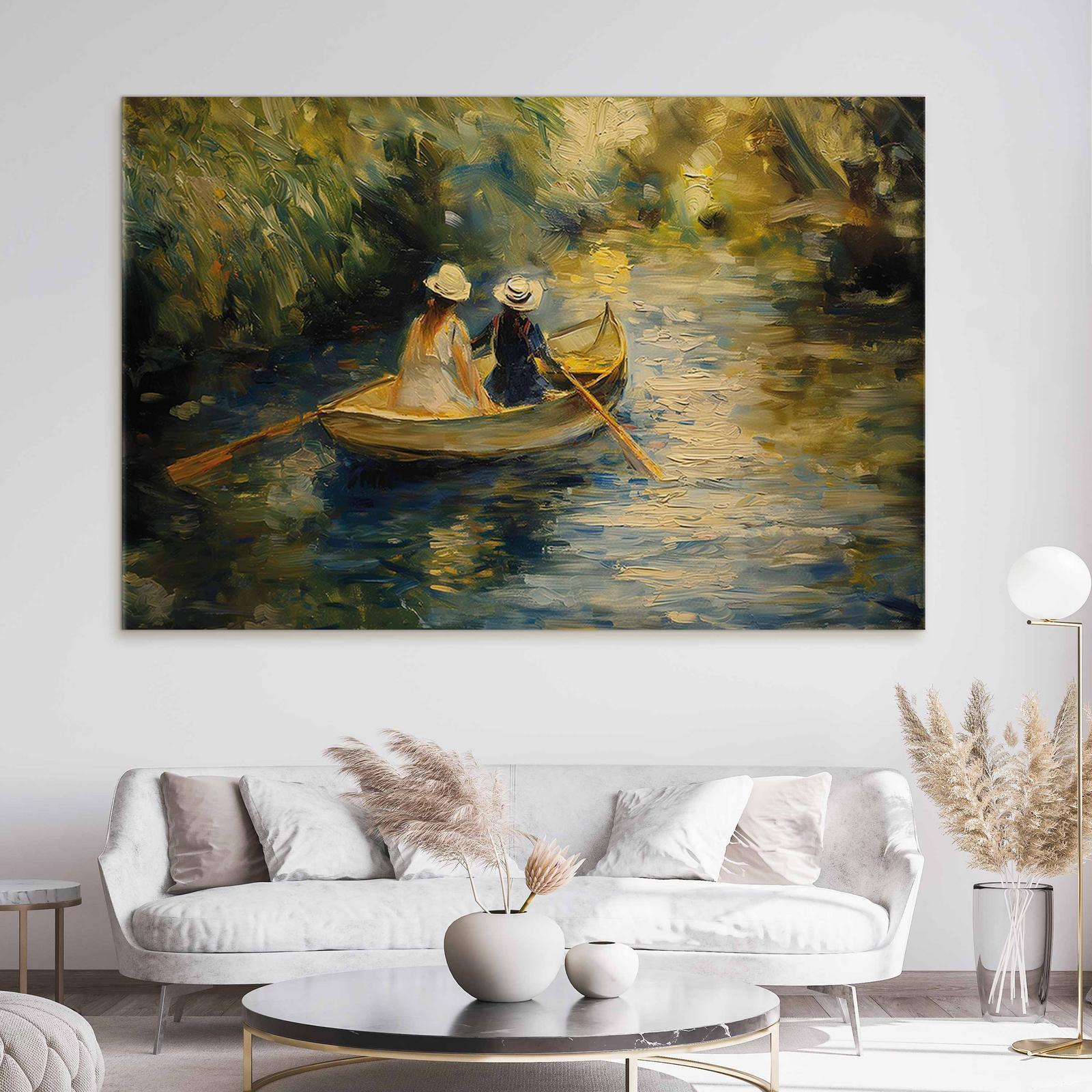Entdecken Sie den neuen Dekotrend mit unseren innovativen faltbaren großen Leinwandbildern im XXL-Format. Diese einzigartigen Produkte kombinieren modernes Design, höchste Materialqualität und eine vollständig eigenständige DIY-Montageweise und bieten so eine einzigartige Lösung für alle Liebhaber origineller Arrangements. Dank der durchdachten Konstruktion aus Basisrahmen und Leinwand mit aufgedrucktem Motiv können wir auch sehr große Bilder sicher und kosteneffizient liefern. Unser Unterscheidungsmerkmal ist die außergewöhnliche Leichtigkeit bei gleichzeitig voller Rahmenstabilität, die Langlebigkeit gewährleistet und die Montage an jeder Wandart ermöglicht. Die Schritt-für-Schritt-Anleitung stellt sicher, dass jede Kundin und jeder Kunde die Montage problemlos bewältigt. "Wandbild XXL - Boat crossing - painting of two women sailing a boat on a river" ist somit die perfekte Option für Personen, die großformatige Kunstwerke schätzen, die sich ohne professionelle Hilfe leicht montieren lassen.