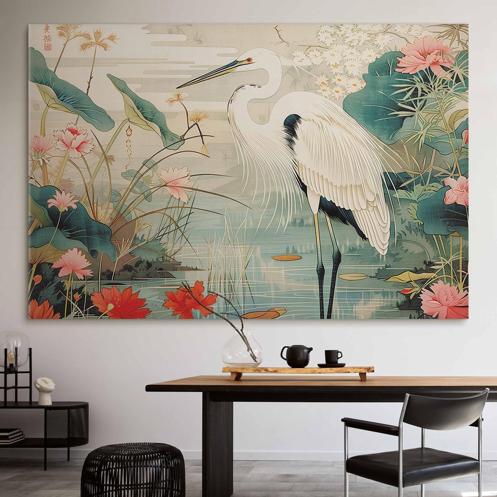 Entdecken Sie den neuen Dekotrend mit unseren innovativen faltbaren großen Leinwandbildern im XXL-Format. Diese einzigartigen Produkte kombinieren modernes Design, höchste Materialqualität und eine vollständig eigenständige DIY-Montageweise und bieten so eine einzigartige Lösung für alle Liebhaber origineller Arrangements. Dank der durchdachten Konstruktion aus Basisrahmen und Leinwand mit aufgedrucktem Motiv können wir auch sehr große Bilder sicher und kosteneffizient liefern. Unser Unterscheidungsmerkmal ist die außergewöhnliche Leichtigkeit bei gleichzeitig voller Rahmenstabilität, die Langlebigkeit gewährleistet und die Montage an jeder Wandart ermöglicht. Die Schritt-für-Schritt-Anleitung stellt sicher, dass jede Kundin und jeder Kunde die Montage problemlos bewältigt. "Wandbild XXL - By an Asian pond - an illustration in the style of a Japanese engraving, depicting a heron" ist somit die perfekte Option für Personen, die großformatige Kunstwerke schätzen, die sich ohne professionelle Hilfe leicht montieren lassen.