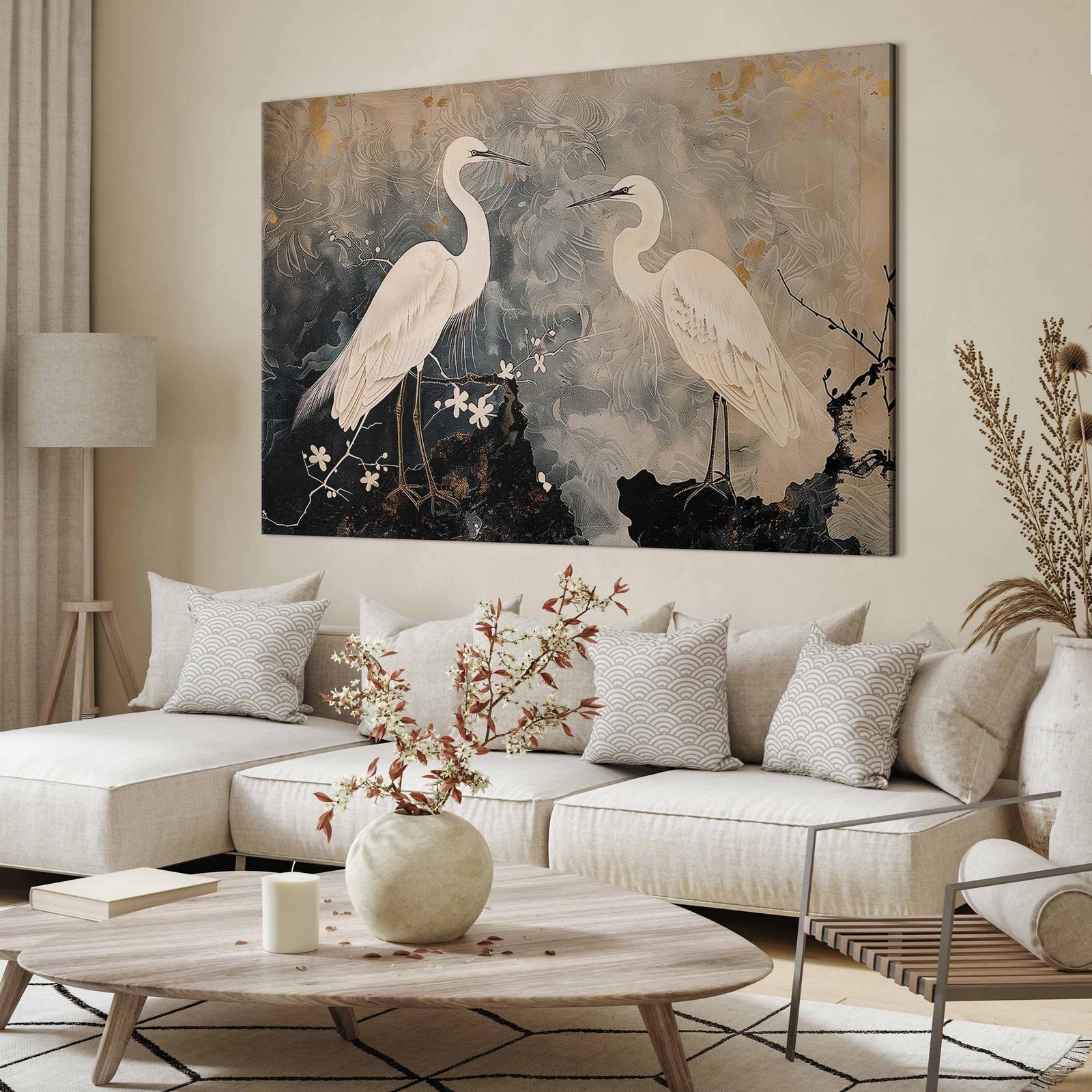 Entdecken Sie den neuen Dekotrend mit unseren innovativen faltbaren großen Leinwandbildern im XXL-Format. Diese einzigartigen Produkte kombinieren modernes Design, höchste Materialqualität und eine vollständig eigenständige DIY-Montageweise und bieten so eine einzigartige Lösung für alle Liebhaber origineller Arrangements. Dank der durchdachten Konstruktion aus Basisrahmen und Leinwand mit aufgedrucktem Motiv können wir auch sehr große Bilder sicher und kosteneffizient liefern. Unser Unterscheidungsmerkmal ist die außergewöhnliche Leichtigkeit bei gleichzeitig voller Rahmenstabilität, die Langlebigkeit gewährleistet und die Montage an jeder Wandart ermöglicht. Die Schritt-für-Schritt-Anleitung stellt sicher, dass jede Kundin und jeder Kunde die Montage problemlos bewältigt. "Wandbild XXL - Herons and cherry blossoms - oriental-style illustration depicting birds" ist somit die perfekte Option für Personen, die großformatige Kunstwerke schätzen, die sich ohne professionelle Hilfe leicht montieren lassen.