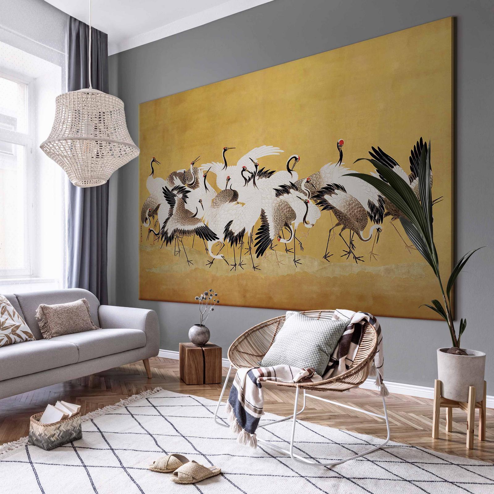 Wandbild XXL - Japanese cranes - a flock of birds against a golden background based on a painting by Ishida Yūtei