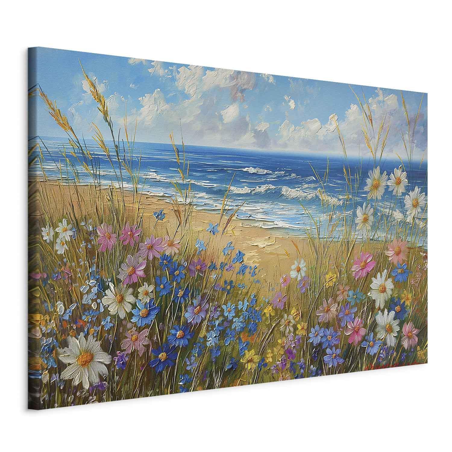 Entdecken Sie den neuen Dekotrend mit unseren innovativen faltbaren großen Leinwandbildern im XXL-Format. Diese einzigartigen Produkte kombinieren modernes Design, höchste Materialqualität und eine vollständig eigenständige DIY-Montageweise und bieten so eine einzigartige Lösung für alle Liebhaber origineller Arrangements. Dank der durchdachten Konstruktion aus Basisrahmen und Leinwand mit aufgedrucktem Motiv können wir auch sehr große Bilder sicher und kosteneffizient liefern. Unser Unterscheidungsmerkmal ist die außergewöhnliche Leichtigkeit bei gleichzeitig voller Rahmenstabilität, die Langlebigkeit gewährleistet und die Montage an jeder Wandart ermöglicht. Die Schritt-für-Schritt-Anleitung stellt sicher, dass jede Kundin und jeder Kunde die Montage problemlos bewältigt. "Wandbild XXL - Seascape – wildflowers and a view of the rough sea" ist somit die perfekte Option für Personen, die großformatige Kunstwerke schätzen, die sich ohne professionelle Hilfe leicht montieren lassen.