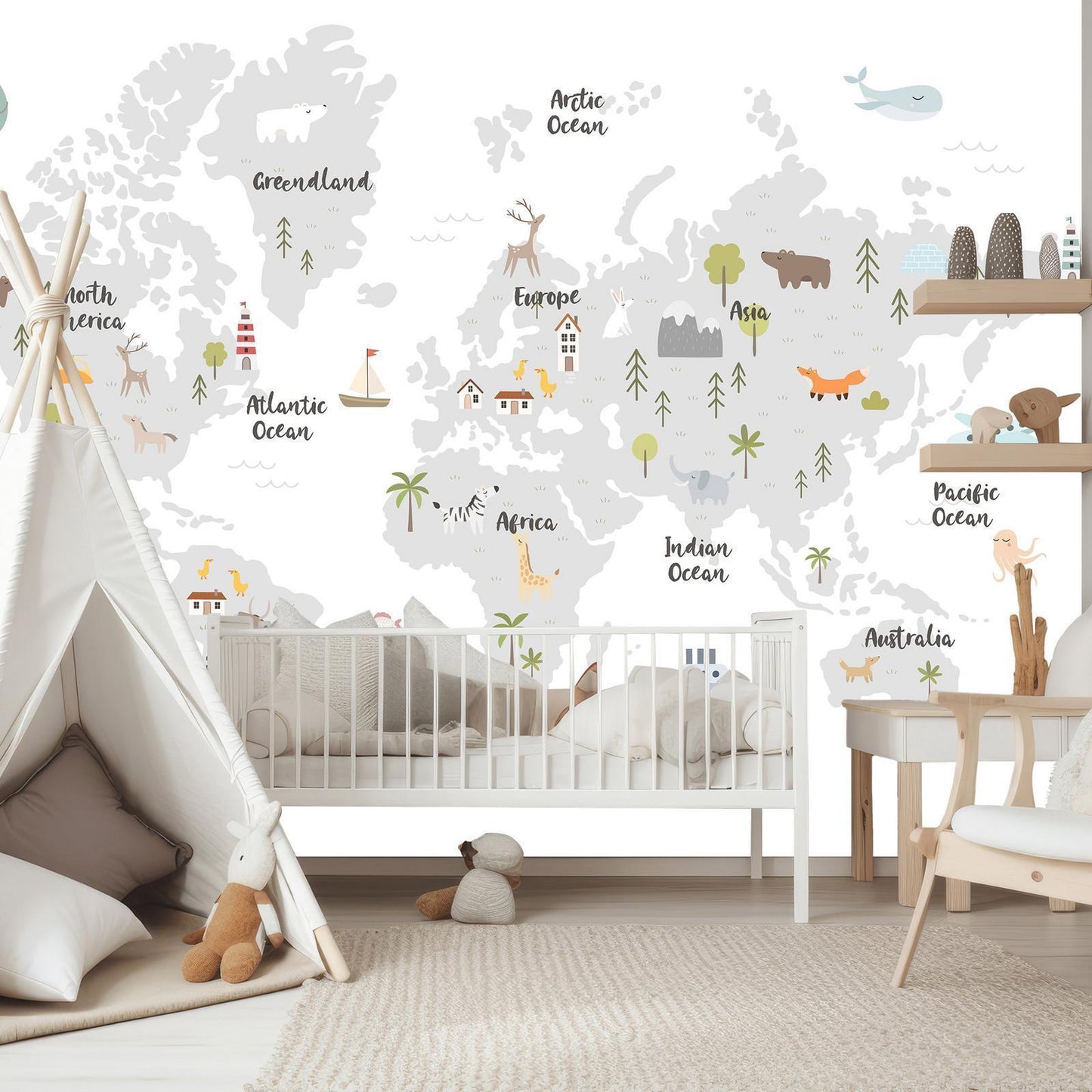 Entdecken Sie die Welt durch die Augen Ihres Kindes mit dem Weltkarten-Wunder – eine Fototapete, die Kinderzimmer in Zentren des Lernens und der Fantasie verwandelt. Diese außergewöhnliche Wandgestaltung verkörpert die Essenz der Weltentdeckung durch ihre liebevoll gestalteten Kontinente, die wie stille Geschichtenerzähler an Ihrer Wand leben.
