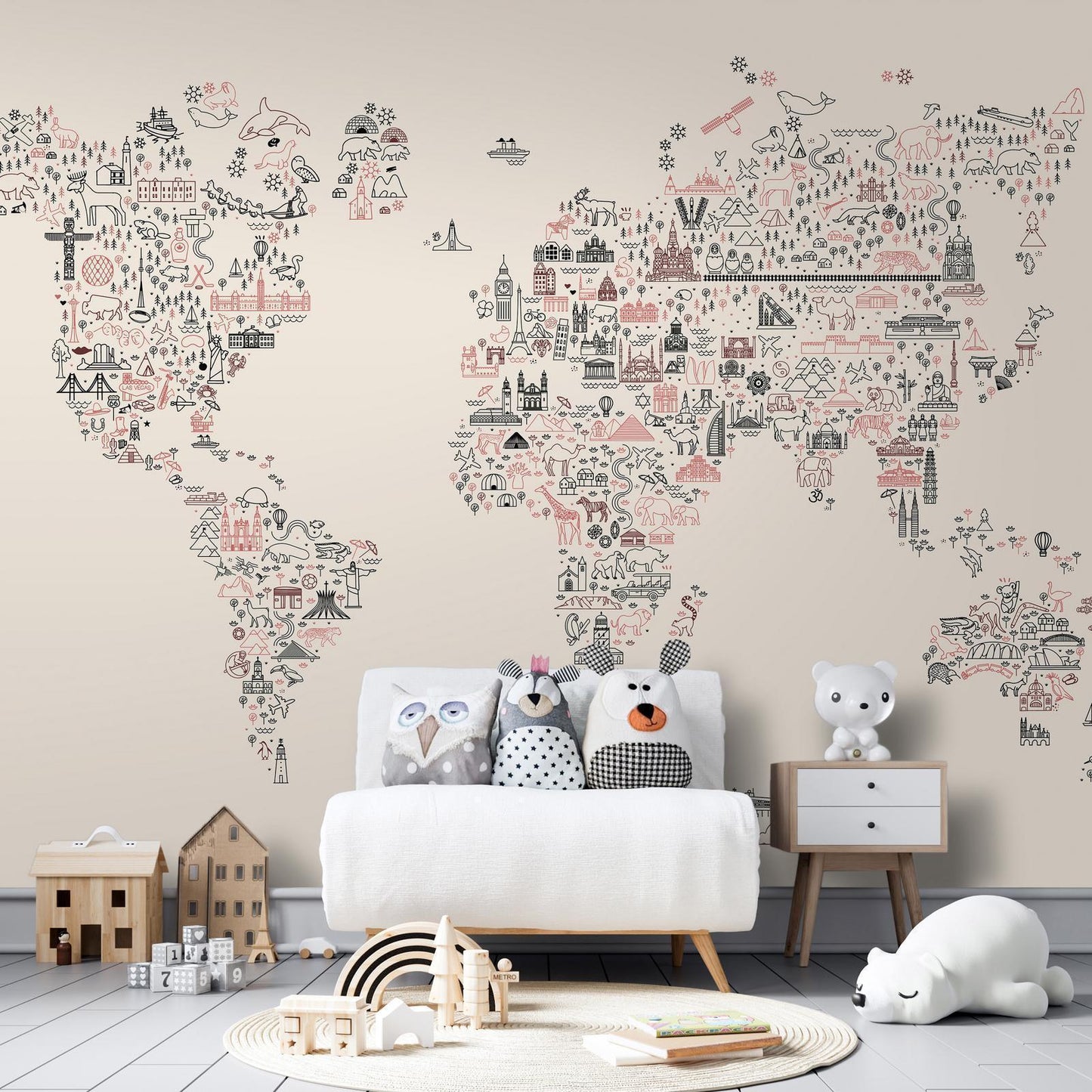 Die Fototapete Weltkarte mit Symbolen harmoniert wunderbar mit verschiedenen Kinderzimmer-Stilen. Im bunten Kinderzimmer unterstreicht sie die fröhliche Atmosphäre, im modernen Kinderzimmer verstärkt sie den lehrreichen Charakter, und in Spielbereichen setzt sie geografische Akzente. Diese vielseitige Wanddeko passt perfekt zu Kindermöbeln aus hellem Holz, pastellfarbenen Textilien oder modernen Lernspielzeugen. Kombiniert mit sanften Pastelltönen, Globen und kindgerechten Accessoires entsteht ein harmonisches Gesamtbild.
